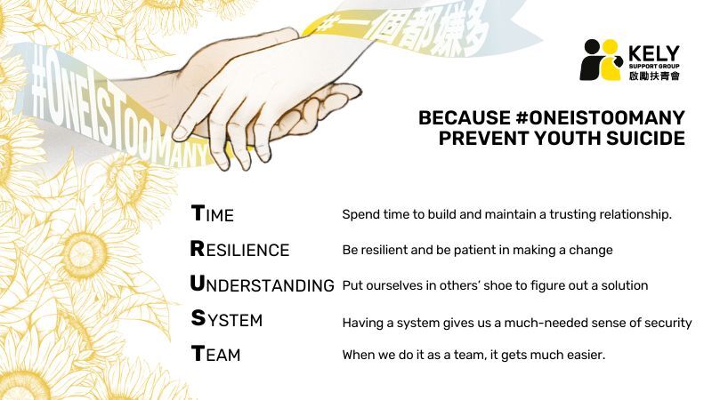 #OneIsTooMany (or #OITM) is KELY’s signature public awareness and education online pledge campaign. The campaign renews every year on World Suicide Prevention Day (10 Sep) with new resources prepared by KELY staff, volunteers and professionals. These resources are compiled for pledged supporters to acquire knowledge and skills to prevent youth suicide.