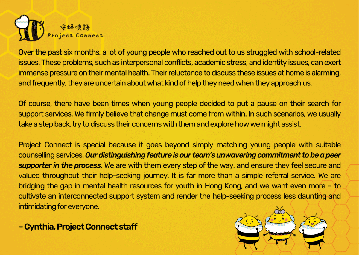 - Project Connect - a project that provides mental health-referral services to guide young people through their help-seeking journey. To date, we have proudly delivered 900+ consultation hours for over 100 youth cases, advising on available treatment options and providing unwavering support along the way.