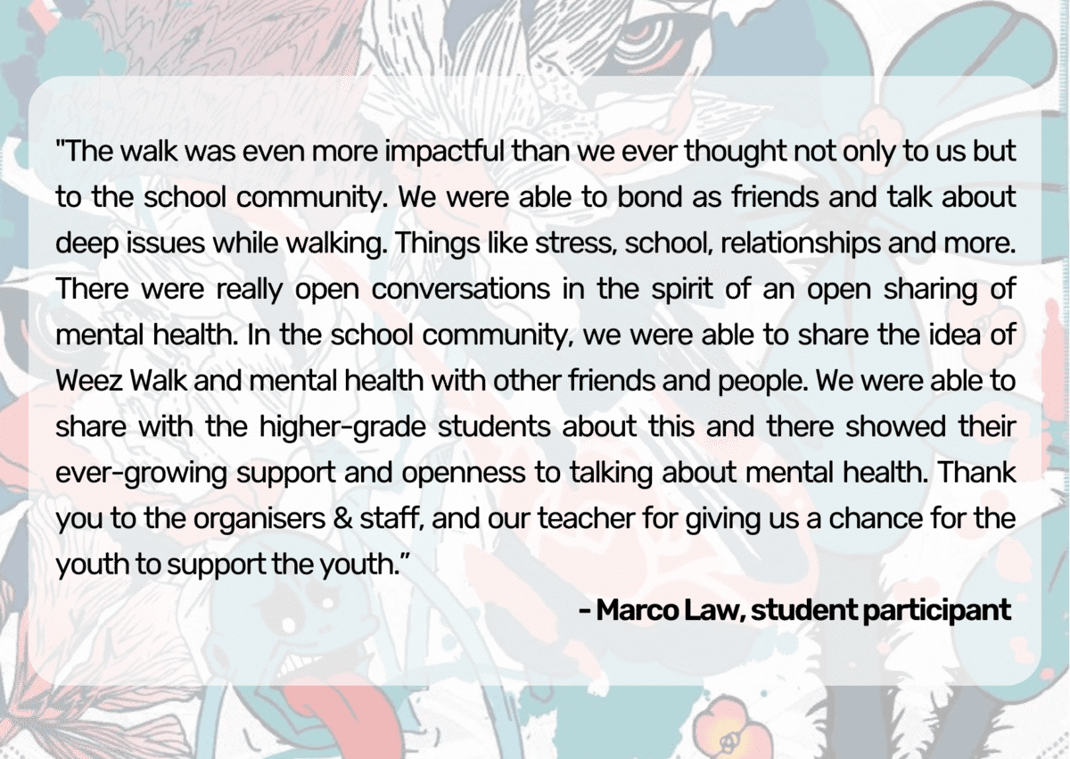 Weez Walk's philosophy is to build an inclusive and resilient community. Since its inception in 2021, we have been firmly committed to fundraising for critical suicide prevention programmes, and creating broader awareness and conversations around youth mental wellbeing.
