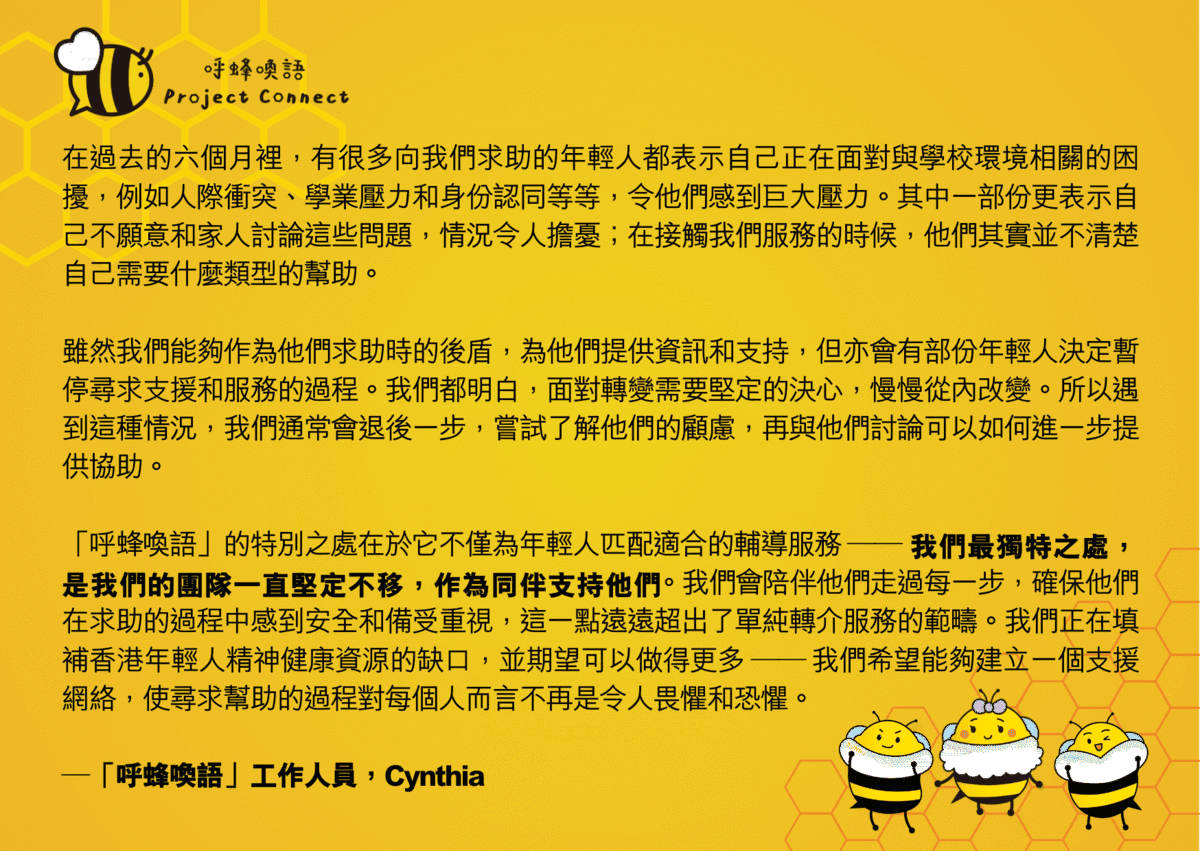 - 「呼蜂喚語」- 青年精神健康轉介服務,旨在於年青人求助過程中陪伴他們並解答疑惑。迄今已為超過 100 位年青人提供多於900小時的諮詢服務,部份更在取其同意後,轉介至相關的合作機構。
