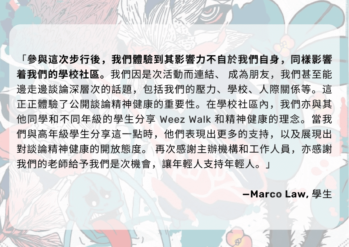 Weez Walk 環島行的淨收入均全數撥捐啟勵扶青會,以支援關注青年精神健康和預防自殺項目。